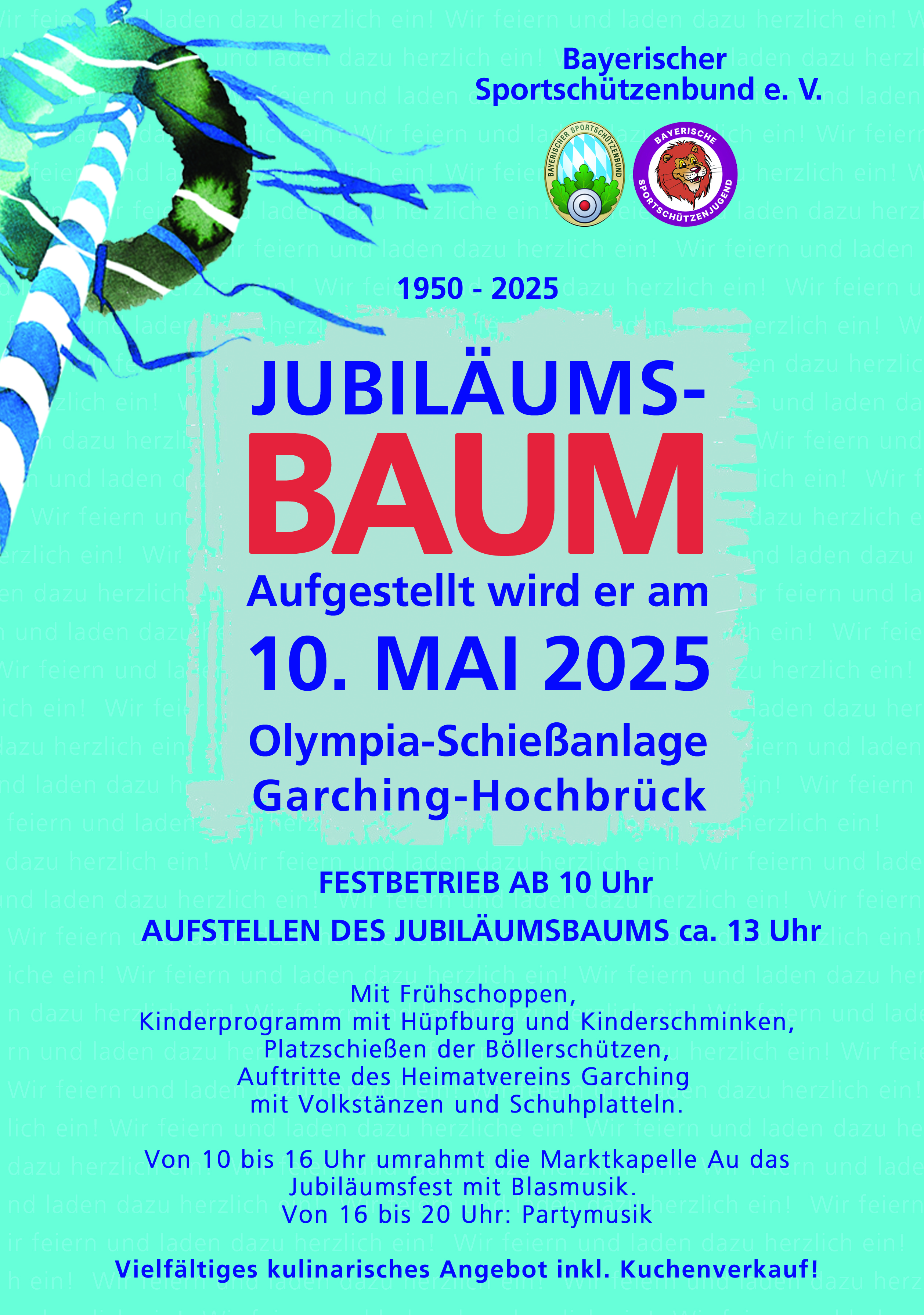 Der Bayerische Sportschützenbund wird 75 Jahre alt! Dies nehmen wir zum Anlass, ein großes Jubiläumsfest auf der Olympia-Schießanlage in Garching-Hochbrück zu feiern! Am 10. Mai 2025 sind alle Vereine und Mitglieder herzlich eingeladen, vorbeizukommen.